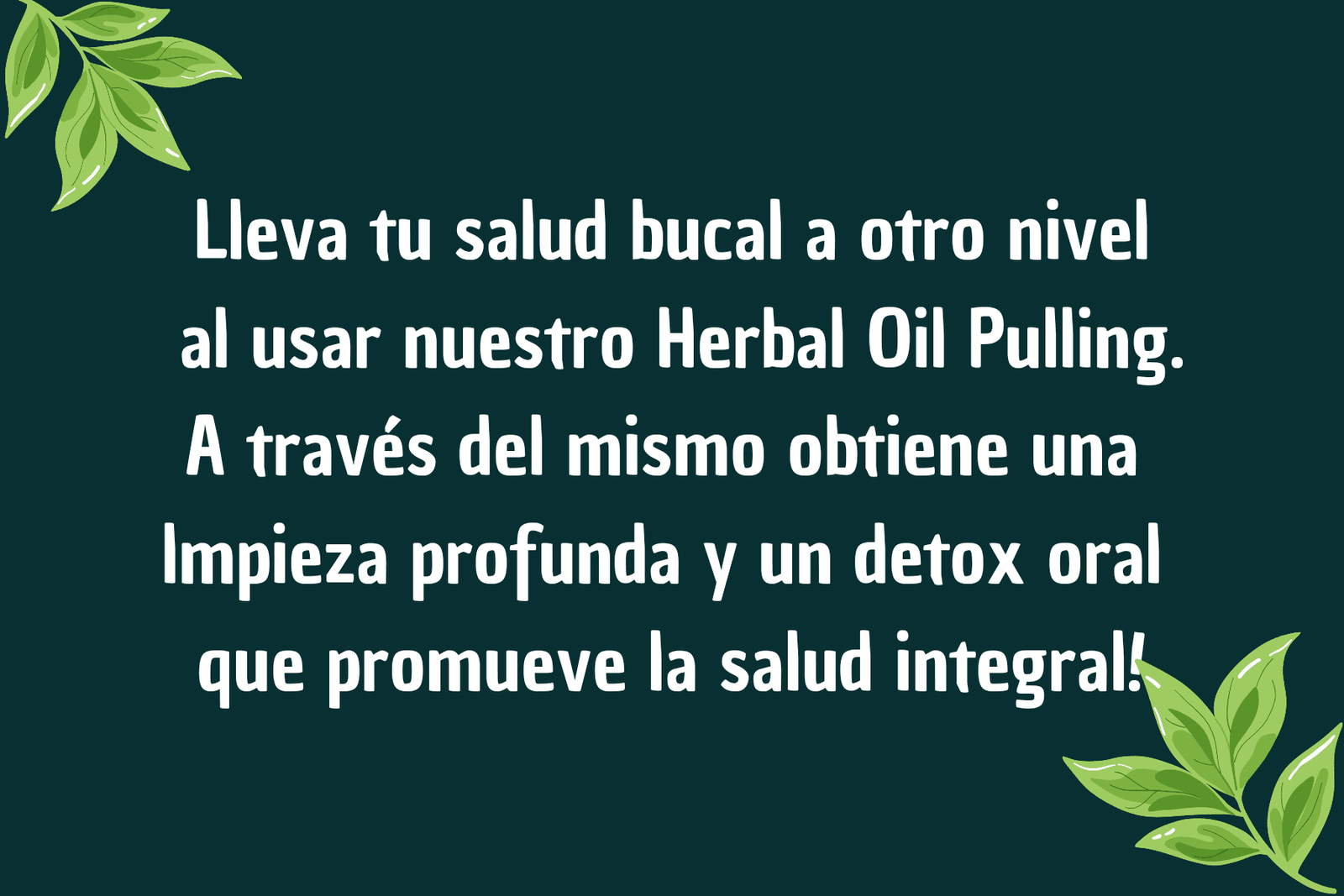 Nuestro Herbal oil Pulling es un enjuague bucal a base de hierbas, formulado con extracto potentes de hierbas que apoyan la salud bucal en general ( inflamación de las encías, enrojecimiento y llagas, promoviendo dientes y encías saludables mientras apoya el aliento fresco.